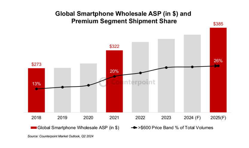 值得注意的是,在整體銷量溫和復(fù)蘇的同時(shí),全球智能手機(jī)的平均售價(jià)(ASP)正穩(wěn)步攀升。據(jù)預(yù)測,2024年ASP將同比增長3%至365美元,而到2025年,則將進(jìn)一步增長5%。