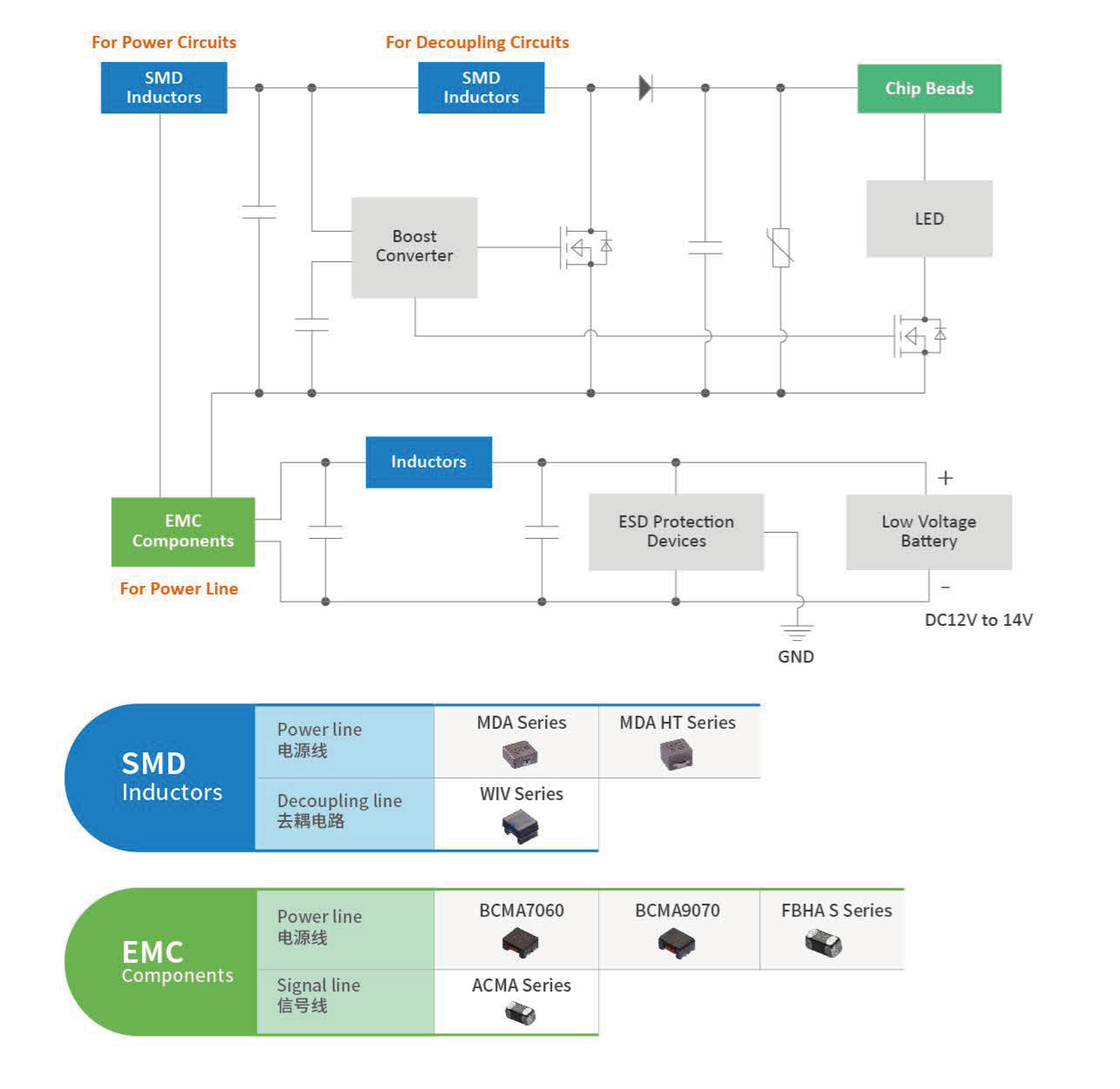 在車燈照明系統(tǒng)中,科或提供的電感產(chǎn)品具備高飽和電流、低損耗和優(yōu)異的電磁轉(zhuǎn)換效率,能夠穩(wěn)定支持LED驅(qū)動(dòng)模塊在各種復(fù)雜工況下的可靠供電,確保車燈在啟停響應(yīng)、亮度控制、動(dòng)態(tài)調(diào)光等功能中始終保持精準(zhǔn)表現(xiàn)。同時(shí),其良好的EMI性能也有助于整車通過電磁兼容測(cè)試,滿足車規(guī)標(biāo)準(zhǔn)。