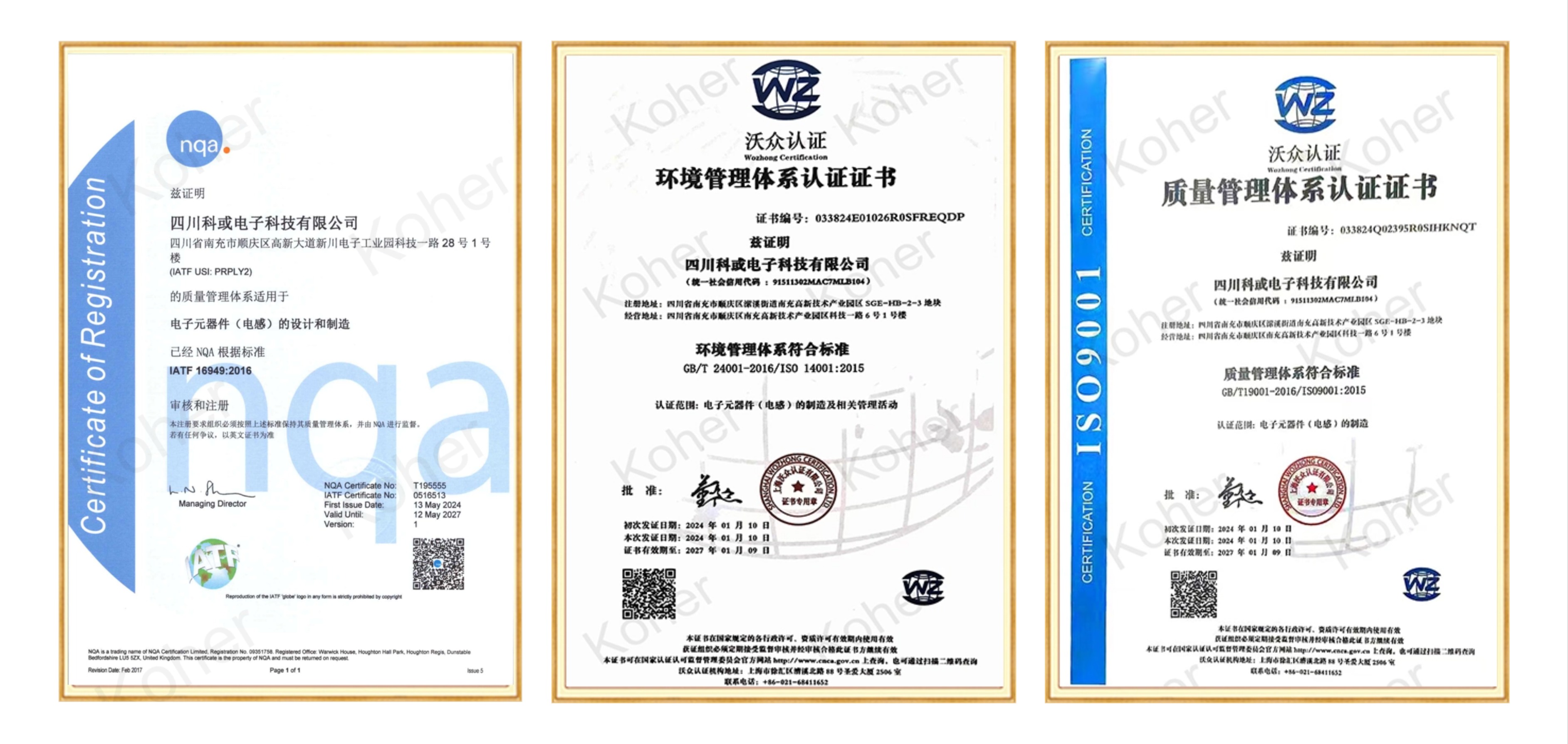 公司已通過ISO9001質(zhì)量管理體系、ISO14001環(huán)境管理體系及IATF16949汽車產(chǎn)品質(zhì)量體系認(rèn)證,同時(shí)產(chǎn)品符合AEC-Q200標(biāo)準(zhǔn),全面推行標(biāo)準(zhǔn)化質(zhì)量控制,全力保障每一件出廠產(chǎn)品的可靠性與可追溯性。