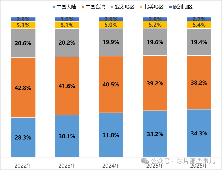 聚焦于中國市場,2022年中國大陸在全球晶圓代工產(chǎn)能中的份額超過了72%,處于這一領(lǐng)域內(nèi)的絕對領(lǐng)先地位,月度產(chǎn)能超過750萬片。據(jù)預(yù)測,到2026年時,中國大陸地區(qū)的晶圓代工月產(chǎn)能有望超越400萬片,占全球總量的比例將達到34.4%,期間預(yù)計實現(xiàn)年均復(fù)合增長率高達13.4%,成為世界上增速最快的區(qū)域之一。值得注意的是,中國臺灣地區(qū)代工產(chǎn)能始終保持全球領(lǐng)先,但由于臺積電調(diào)整了其投資建廠的戰(zhàn)略方向,導(dǎo)致該地區(qū)在全球市場上的份額呈現(xiàn)逐年遞減的趨勢。
