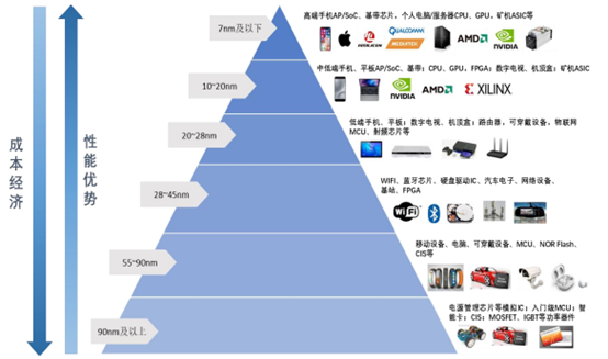 半導體制程以28nm為界線,分為先進制程和成熟制程,不同工藝制程分別對應不同的應用領域。