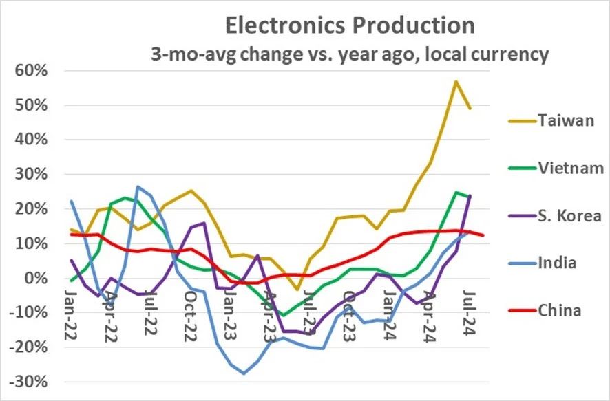 相較于其他亞洲新興經(jīng)濟(jì)體,眾多亞洲發(fā)展中國(guó)家與地區(qū)的電子產(chǎn)品制造業(yè)正見(jiàn)證著顯著的增勢(shì)。其中中國(guó)臺(tái)灣和韓國(guó),展現(xiàn)出蓬勃的新興態(tài)勢(shì),尤其自2023年中期以來(lái),生產(chǎn)活動(dòng)呈現(xiàn)出積極的回升跡象。