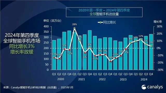 市場研究機(jī)構(gòu)Canalys發(fā)布的報告顯示,2024年第四季度全球智能手機(jī)市場同比增長3%,出貨量達(dá)到3.3億臺,實現(xiàn)了連續(xù)五個季度的正增長 。而全年出貨量更是達(dá)到12.2億臺,同比增長7%,這一數(shù)據(jù)直觀地展現(xiàn)出智能手機(jī)市場的龐大體量與持續(xù)擴(kuò)張的態(tài)勢。