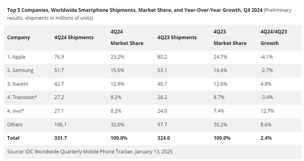 與此同時,國際數(shù)據(jù)公司IDC也發(fā)布了2024年第四季度全球智能手機(jī)市場的出貨情況,數(shù)據(jù)顯示,該季度全球智能手機(jī)出貨量實現(xiàn)了2.4%的同比增長,達(dá)到3.317億部,這一增長趨勢已持續(xù)六個季度。全年來看,出貨量同比增長6.4%,總量達(dá)到12.4億部。IDC還預(yù)測,2025年市場將繼續(xù)保持增長態(tài)勢。