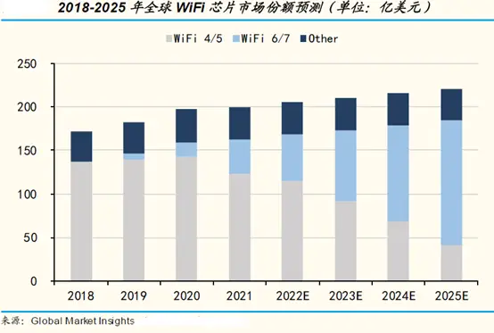 根據(jù)Global Market Insights發(fā)布的數(shù)據(jù)顯示,2021年全球Wifi芯片市場規(guī)模超過200億美元,預計從2021年至2028年間,該市場將以2.5%的年平均復合增長率穩(wěn)步增長,到2025年市場規(guī)?;驅⑦_到220億美元。不僅如此,ABI Research統(tǒng)計的數(shù)據(jù)也顯示,2021年全球Wifi芯片出貨量超過34億顆,且預測期內將以7.3%的復合年增長率增長,到2025年預計將增至45億顆,這足以表明Wifi技術在全球范圍內的持續(xù)普及與應用深化,為相關產業(yè)鏈上下游企業(yè)帶來了廣闊發(fā)展機遇的同時行業(yè)正發(fā)展迅速。